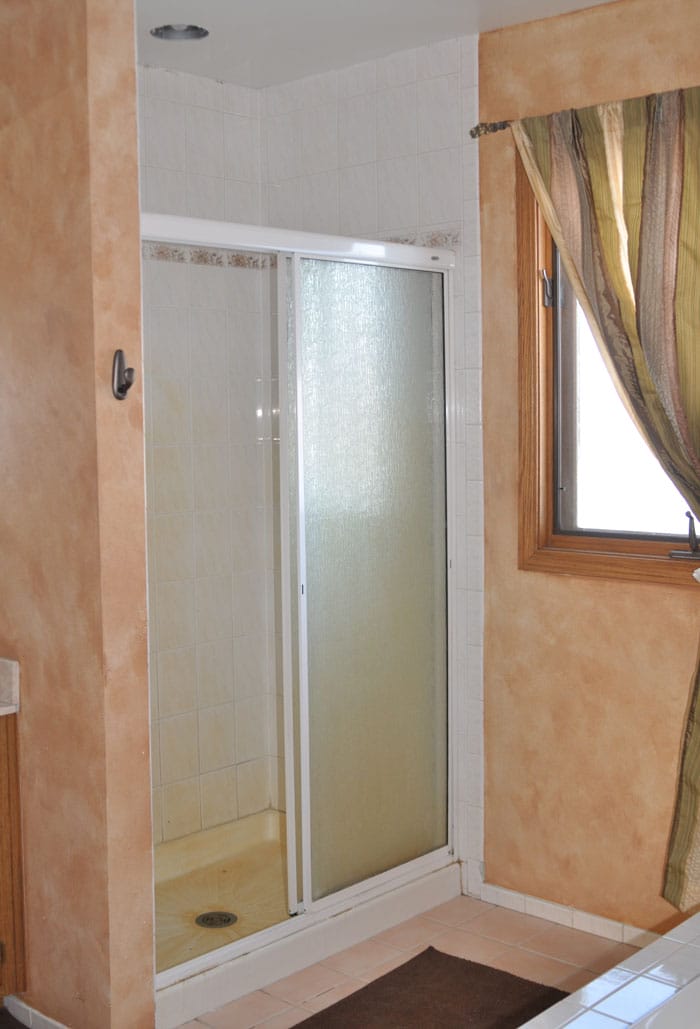 Now I almost didn’t show the shower… that would be because it’s so yucky and embarrassing!! Beside more of the 80’s flowers it also had terrible yellow water stains on it (well water), mold, and tiles falling off (main reason we decided to do this remodel). Plastic shower basins should NEVER be used when you have well water!! I have tried everything to get it clean.. the only thing I have found that cleans it is CLR but OMG I can’t breath after I use that stuff. Oh and wait notice there was no cover on the light… for the past 4 years I have never turned on the shower light, I was so afraid of shorting it out…lol.
